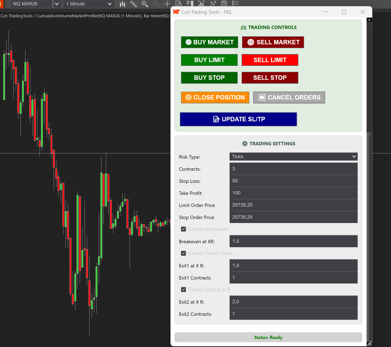 Cot-Trading Order Panel is a professional-grade trading dashboard designed for NinjaTrader , delivering advanced order management, real-time trade monitoring, and sophisticated risk control through a clean and intuitive visual interface.